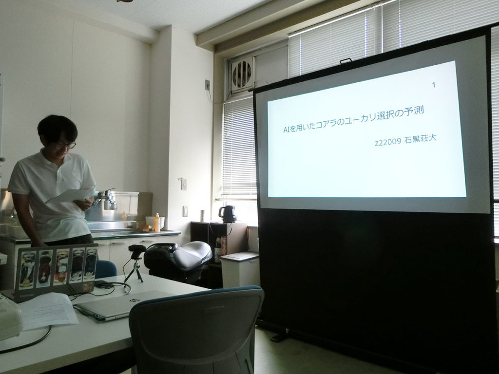 最初に発表したのは石黒くんで、自身の研究計画や、関連情報としてAI(人工知能)の種類や活用方法などについて紹介してくれました。