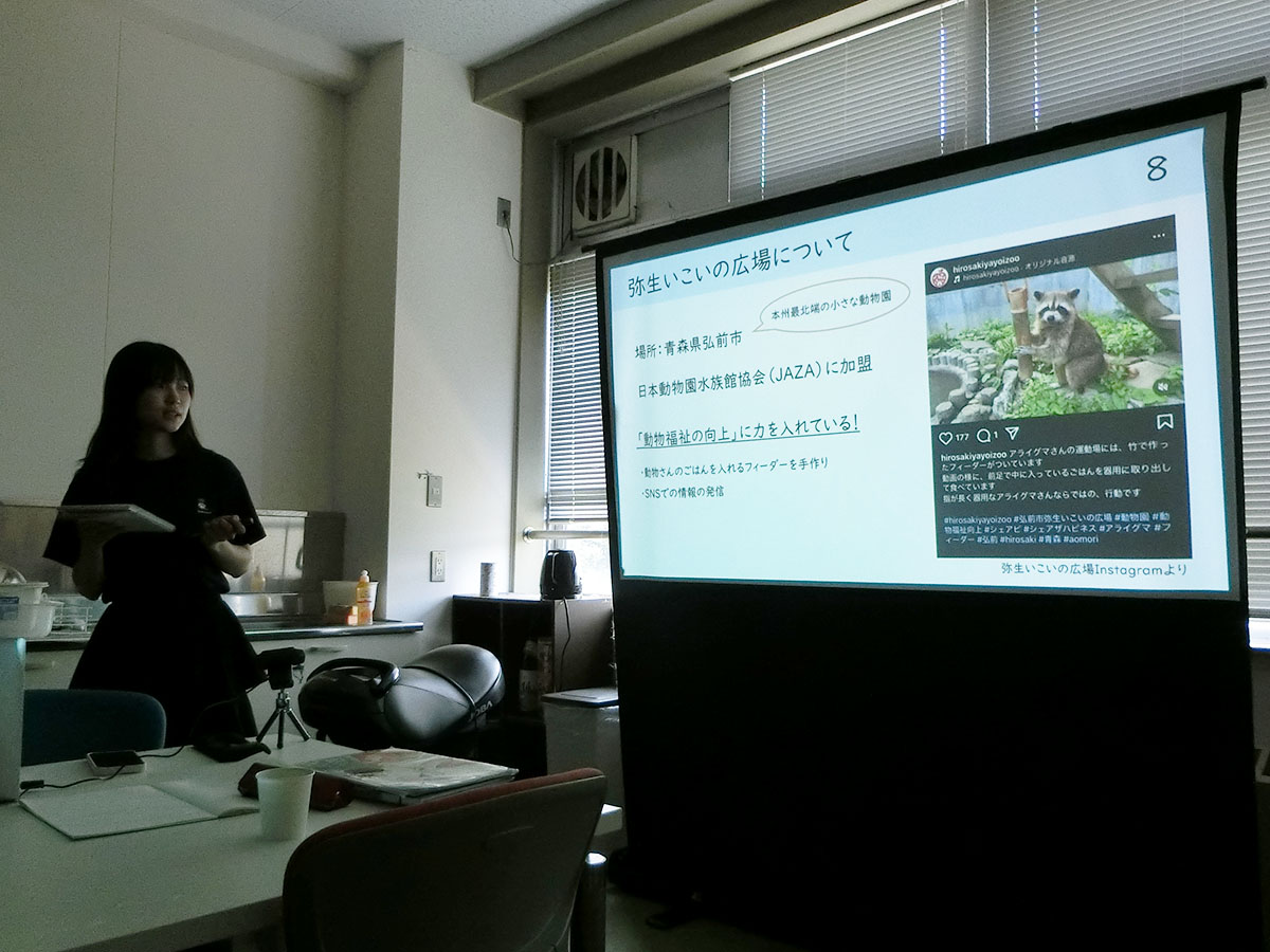 最初に発表したのは戸張さんで、研究対象となる弥生いこいの広場のペンギンの紹介や、研究計画について話してくれました。