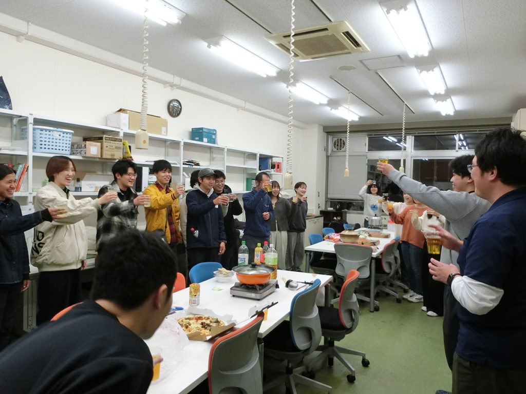 今日は研究室に配属された3年生を迎えて、研究室で親睦会を開催しました。3年生と4年生がこれだけの人数で一度に集まるのは今年初めてです。