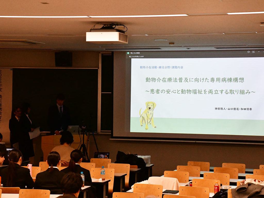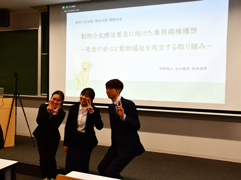 その後は学生たちによる実習報告と課題発表でした。当研究室では動物介在活動・療法分野の指導を担当しました。
